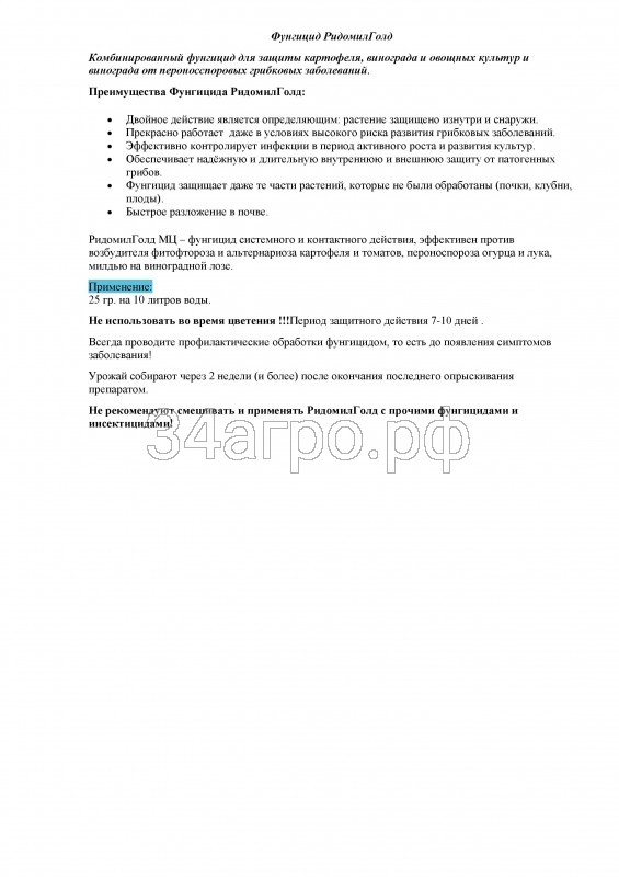 Ридомил Голд - комбинированный фунгицид для защиты картофеля, овощных культур и винограда от комплекса болезней, включая пероноспороз, альтернариоз, фитофтороз, милдью. Длительная защита полностью всего растения, включая необработанные части — новый прирост листа, точку роста, стебель, клубни картофеля, плоды томата