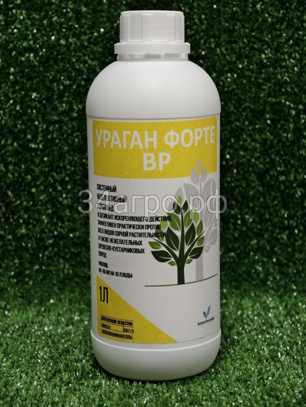 Уничтожает самые злостные сорняки (осот, пырей, свинорой, вьюнок и др и древесно-кустарниковую растительность. Обработанные сорняки не отрастают вновь! Содержит уникальные поверхностно-активные вещества, обеспечивающие более быстрое проникновение и перераспределение действующего вещества в растении. УРАГАН® форте работает значительно быстрее, чем другие гербициды на основе глифосата. Способ применения: перед обработкой не следует полоть и косить сорняки. Налить в ведро 1–2 л воды, вскрыть тубу, отмерить количество препарата в соответствии с таблицей, вылить в ведро с водой и тщательно перемешать, затем довести раствор до требуемого объёма и перемешать ещё раз. Раствор хранению не подлежит. Опрыскивать растения свежеприготовленным раствором в сухую безветренную погоду (дождь, прошедший ранее, чем за 6 ч после обработки, может смыть препарат и значительно снизить эффект), желательно утром или вечером, равномерно нанося на листья сорняков путем опрыскивания или смачивания листьев. Малотоксичен для пчел, рыб и других водных организмов. Преимущества перед другими гербицидами.